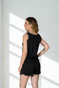 Confeccionado em tecido canelado macio e agradável ao toque, ele proporciona sensação suave na pele e excelente caimento. A blusinha regata possui modelagem solta e confortável, enquanto o shorts com elástico e cordão ajustável garante ajuste perfeito ao corpo sem apertar.